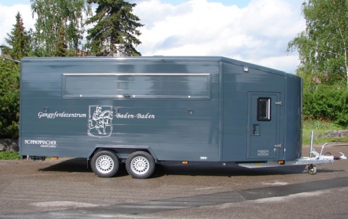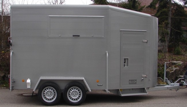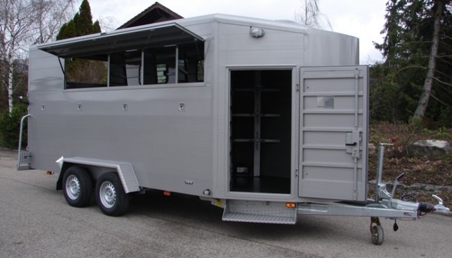Der Außenbereich des Anhängers wird durch die stirnseitige Rundung sowie durch die abgerundeten Dachprofile geprägt. Durch die groß dimensionierten Türen wird das Ein- sowie Aussteigen in die Sattelkammer bzw. in den Pferdebereich erleichtert. Auf Wunsch montieren wir natürlich auch Trittstufen an den Einstieg. Die Türen können im offenen Zustand durch einen Türfeststeller arretiert werden.
