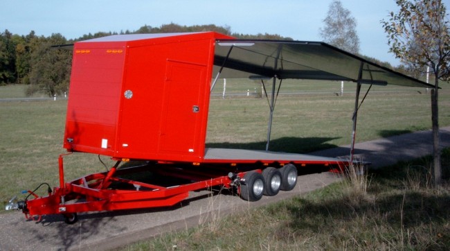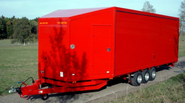 Komplett geschlossener Kofferaufbau mit 3-seitig Klappen, 2 Schlupftüren vorne in der Schräge, 3-Achs- Fahrgestell, Rückwärtskipper mit langer Auffahrrampe, Gesamtgewicht 3.500 kg, Länge 7.000 mm, Breite 2.300 mm, Höhe 1.900 mm, Alu-Boden, Lackierung innen und außen. Radantrieb mit Funkfernbedienung zum rangieren, elektrische Seilwinde mit Funkfernbedienung, elektrohydraulisches Kippaggregat mit Funkfernbedienung, Notstromaggregat mit DTM-Tankstutzen von außen betankbar, Ladestrom, separates Ladegerät für die Batterie, 230 V Elektroanschluss, Staukasten mit Rollladen für die Aggregate und Ersatzbereifung, exklusive Außenbeleuchtung sowie Halogen Innenbeleuchtung.