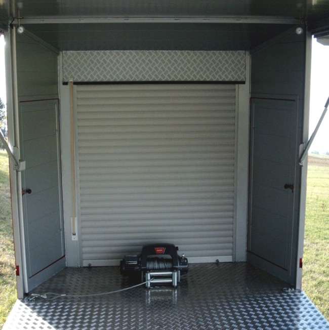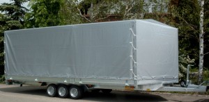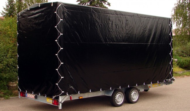 Ihren Anhänger erhalten Sie natürlich auch als Planenfahrzeug, natürlich auch mit einer Planenspitze. Die zum Autotransport benötigten Auffahrschienen werden im Rahmen unten eingeschoben. Eine elektrische Seilwinde und zwei Ersatzräder wurden stirnseitig in der Spitze verstaut.