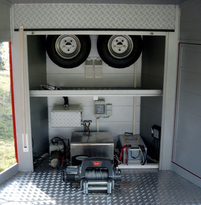 Der Anhänger wird mittels einer doppelt wirkenden Hydraulikpumpe nach hinten gekippt, die mit der Batterie in der Staukiste vorne untergebracht ist. Die Staukiste wurde etwas größer gefertigt um Radspanngurte u.ä. mitzuführen.