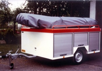 Für die DLRG wurde dieser Anhänger gefertigt. Die verschieden große Staufächer wurden mit Alu-Rolladen verschlossen. Auch ein Notstromaggregat mit Schwerlastauszug wurde in den Anhänger eingebaut. Das Schlauchboot zur Wasserrettung wurde platzsparend auf dem Dach verstaut.