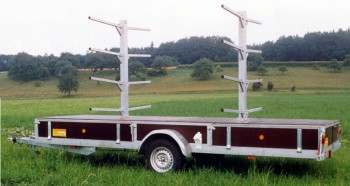 Wir bauen Ihn z.B. für acht Kanadier mit Paddel und Gepäck. Die vor und hinter dem Radkasten angebrachten Klappen dienen zur be- und entladung der Güter. Die Bodenplatte deckt die komplette Fläche unten wasserdicht ab, somit bleiben die Güter trocken. Der Anhänger kann natürlich auch für den Transport von Fahrrädern umgerüstet werden.