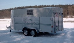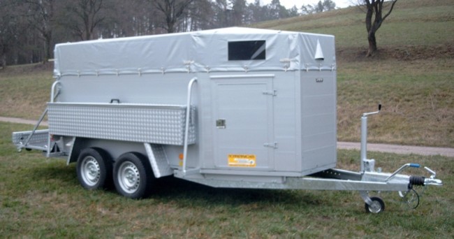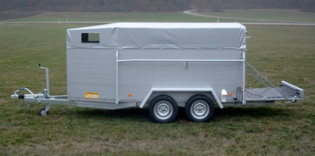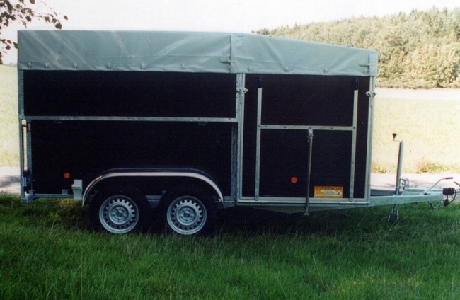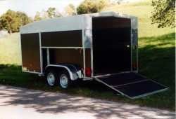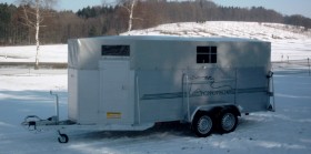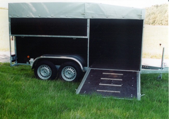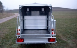 Um 4 Shettlandponys in Querstellung und noch eine größere Kutsche zu transportieren, wurde dieser Anhänger nach Kundenvorgaben gefertigt. Es könnten aber auch bis zu 8 Ponys in dem Anhänger transportiert werden. Die Kutsche wird hintern in Längsrichtung transportiert. Um die Kutsche im Anhänger zu befestigen, wurden Zurrösen in die Seitenwand innen eingelassen.