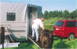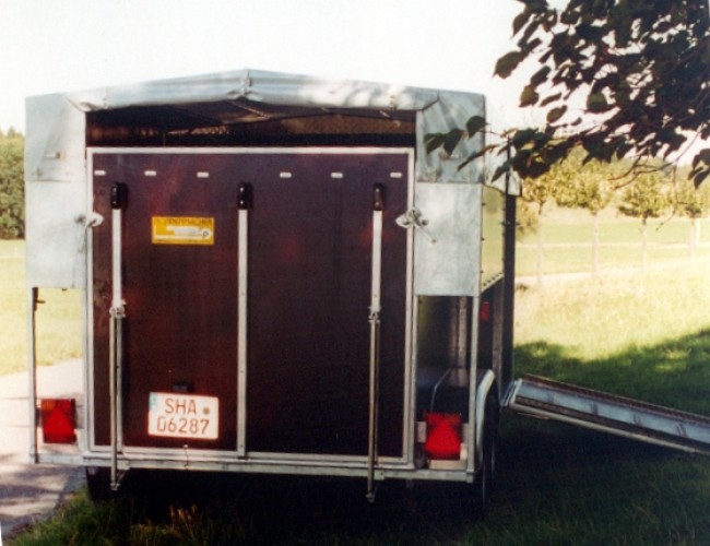 Dieser Anhänger wurde speziell auf Kundenwunsch konstruiert. Hier können entweder 2 Großpferde, 5 Shetlandponies oder 2 Shetlandponies und eine Kutsche transportiert werden. Die Kutsch steht in diesem Fall hinter den Ponies (wo im dritten Bild die Fahrräder stehen).