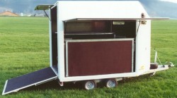 Dieser Anhänger wurde für den Pferdetransport von 3 Großpferden spwie als Verkaufsanhänger konstruiert und gefertigt. Die Pferde stehen bei diesem Anhänger in Längsrichtung und werden durch feste Trennwände abgeteilt. Die Trennwände sind schnell demontierbar, und der Anhänger somit schnell zum Verkaufsanhänger umgerüstet. Der Verkauf der Waren erfolgt wettergeschützt unter der seitlich angebrachten Verkaufsklappe.