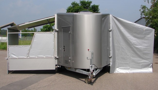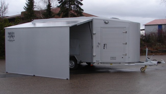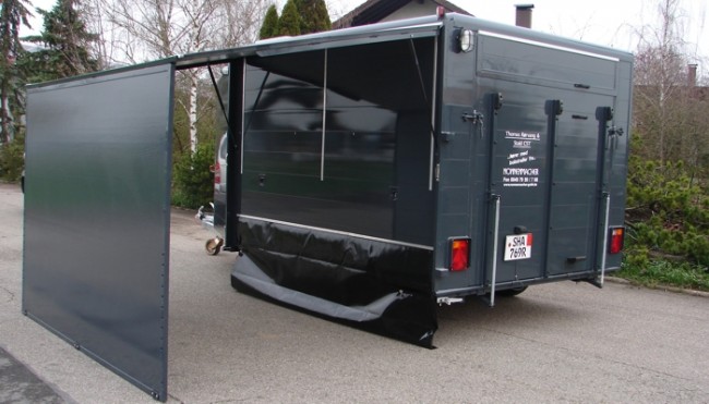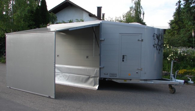 Die stabilen Dach- und Wandelemente sind aus leichten Kunststoff-Paneelen, diese sind mit Alu-Profilen eingefasst und werden einseitig im Grundton des Anhängers lackiert.