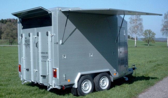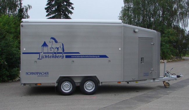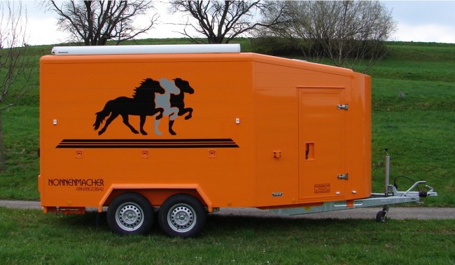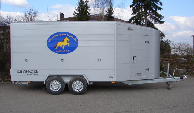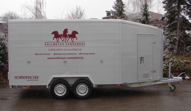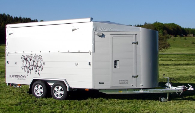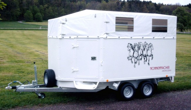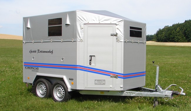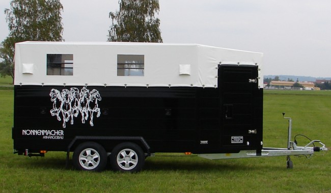 Auch die Planenfahzeuge erhalten Sie bei uns z.B. mit großer begehbarer Sattelkammer mit vergrößerter Einstiegstüre, Rundung oder auch einer Markise. Die Servicetüre zwischen dem Pferdebereich und der Sattelkammer ist natürlich auch Standard.