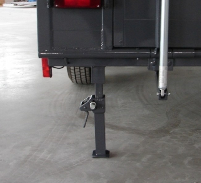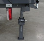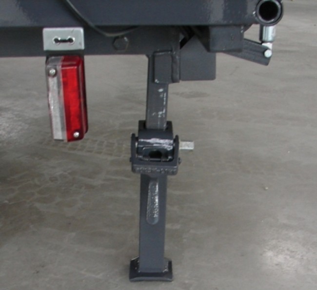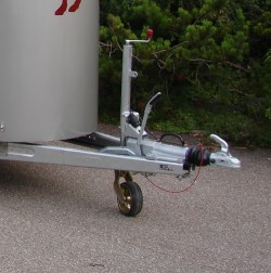 Um den Anhänger als Nachtbox für ein Pferd nutzen zu können werden Abstellstützen benötigt, damit der Anhänger optimals steht. Die von uns verwendeten Patent-Abstellsützen sind äußerst leicht zu bedienen. Es wird nur der im Bild links dargestellte Hebel gedrückt, anschließend die Stütze geschwenkt und unter Spannung gesetzt. Nun ist die Stütze fertig aufgebaut, ohne Werkzeug in nicht einmal 10 Sekunden ist die Stüzte arretiert. Eine Stütze hat hierbei eine Tragfähigkeit von 700 kg, damit haben beide Stützen zusammen 1.400 kg Tragfähigkeit.