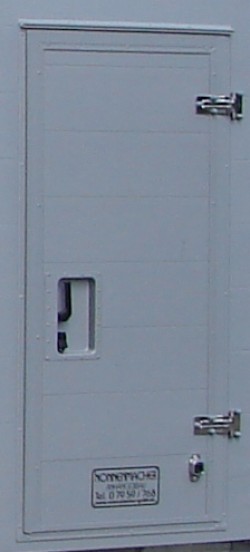 Bei allen Nonnenmacher Anhängern werden die 1.600 mm Hohen Türen auf 2 großen V2A Scharnieren gelagert. Die Türen verfügen alle über einen Türfeststeller. Die Türe besitzt ebenso eine 2-Punkt-Verriegelung mit einem großen mechanischen Schloss, natürlich mittel einem BKS-Schloss abschließbar. Die Türe wird mittels langlebiger Einfassungen aus Aluminium umrahmt. Um die Türe abzudichten wird eine Alu-Regenleiste über der Türe angebracht sowie die Türeinfassung mit einem Dichtungsband abgedichtet.