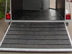Wir verwenden als Rampenbelag eine extem widerstandsfähige und rutschfeste Gummimatte aus dem Pferde-LKW-Bereich. Die Matte besitzt hohe sowie kleine eingebaute Gummi-Trittleisten, diese verhindern somit Verletzungen durch Abrutschen Ihres Pferdes beim Verladen. Die Rampenmatte wird oben und unten mit einer Alu-Riffelblechleiste eingefasst, um eine lange Haltbarkeit der Matte zu gewährleisten. Der Fahrzeugboden wird mit einem gelenkschonenden flüssig verlegtem Gummiboden belegt.