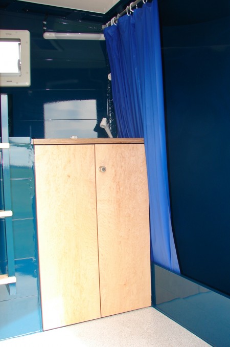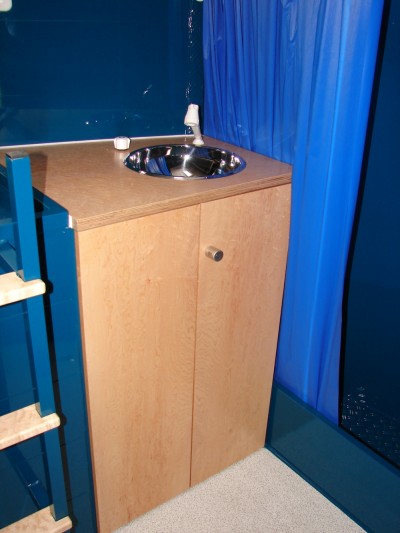Der Unterschrank des Waschbeckens dient zur Aufbewahrung des Wasserbehälters sowie zur Aufnahme der mobilen Toilette.