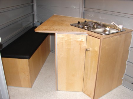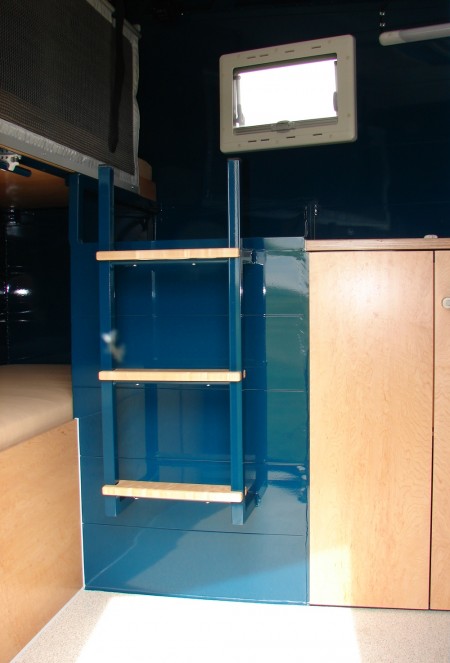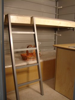 Das obere Bett ist nach hinten abklappbar. Dadurch entsteht ein Sitzbereich unten, damit an der angebrachten Koch- bzw. Essecke die gekochten Speisen in Ruhe verspeißt werden können.
