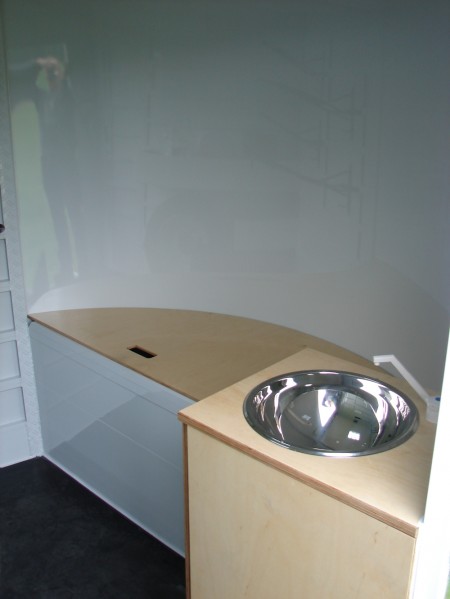 In der Rundung des Anhängers wurde eine Dusche mit Duschvorhang und Wasserablauf montiert.