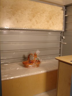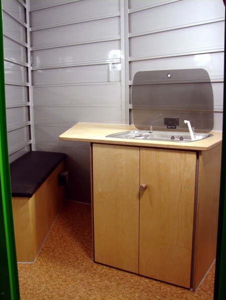 Der Deckel, in der aus Alu-Profilen gefertigte Sattelkammer, wurde von außen zugänglich gestalltet und dient im Wohnbereich als Ablage. Die externe Sattelkammer hat den Vorteil, dass die verschwitzen Sättel nicht im Wohnbereich gelagert werden müssen.