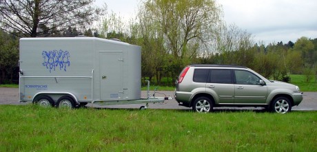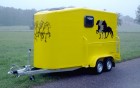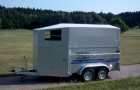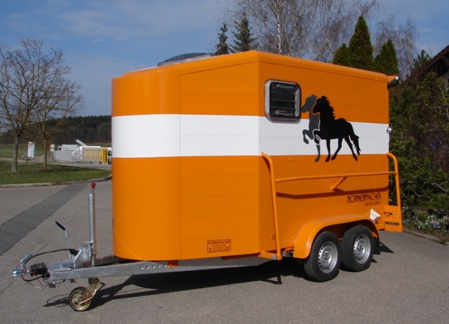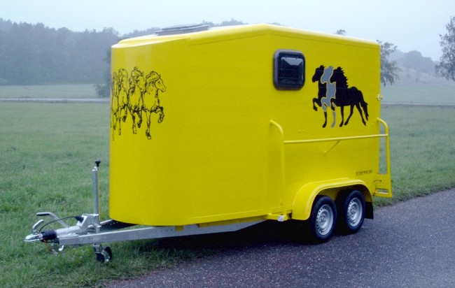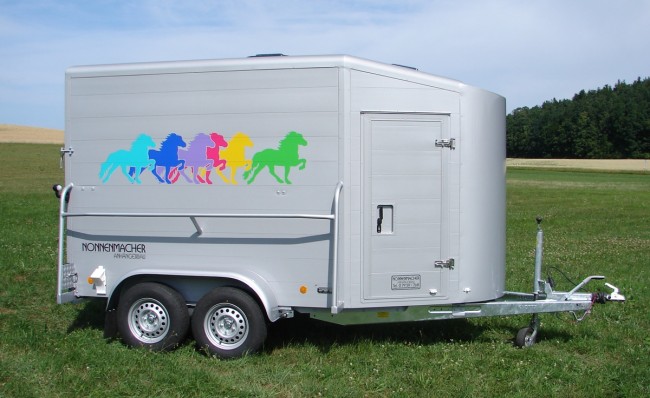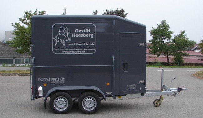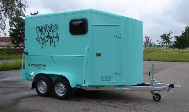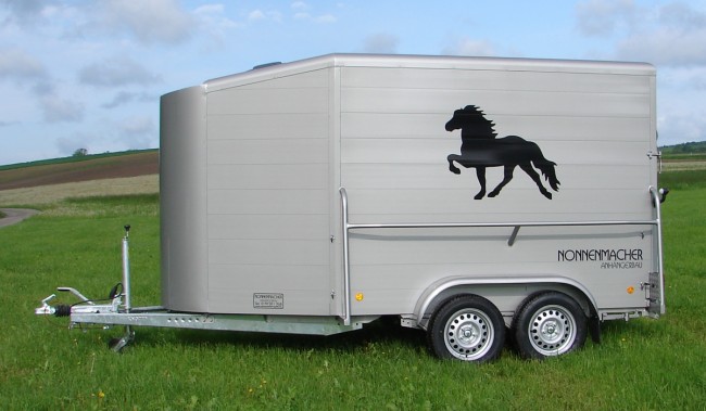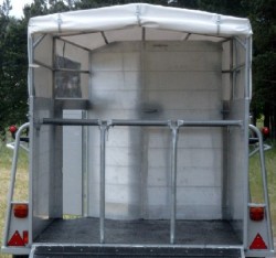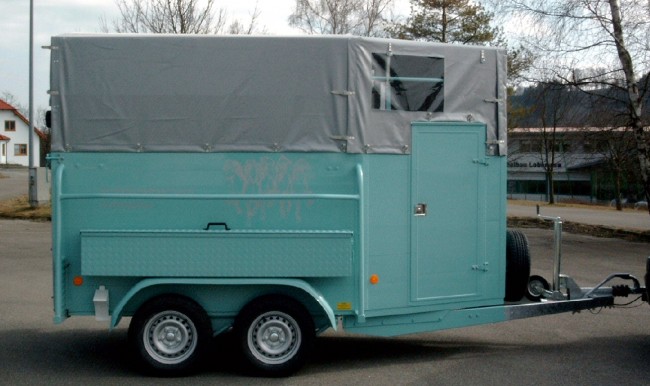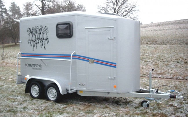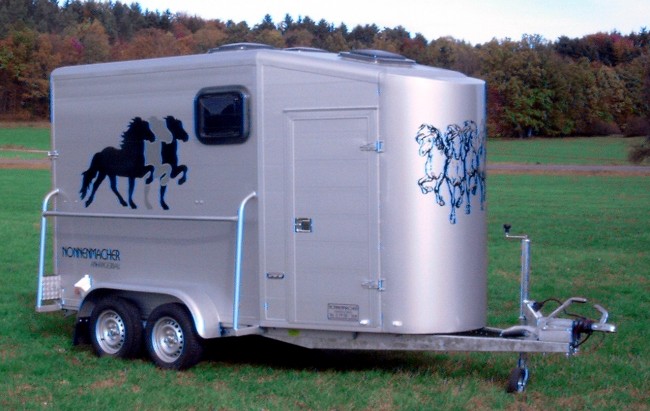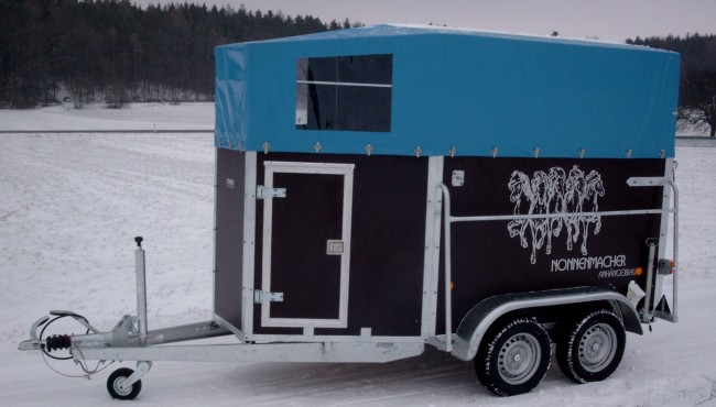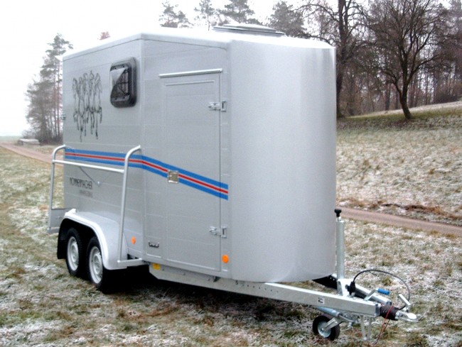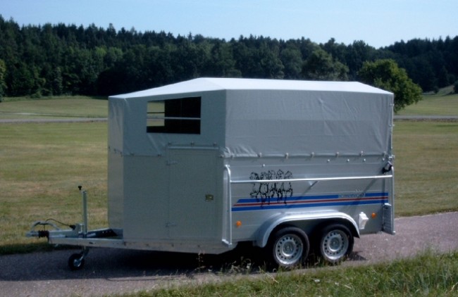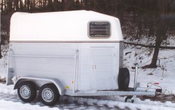 Bis vor einigen Jahren war dies ein ganz besonderer Anhänger mit Rahmen, Boden und Bordwänden aus Aluminium und einer Polyhaube. Die hier optinal eingebaute Sattelkammer ist eine Sattelkammer im wahrsten Sinne des Wortes, d.h. außer 2 Sätteln und Trensen hat dort nichts anderes mehr Platz.